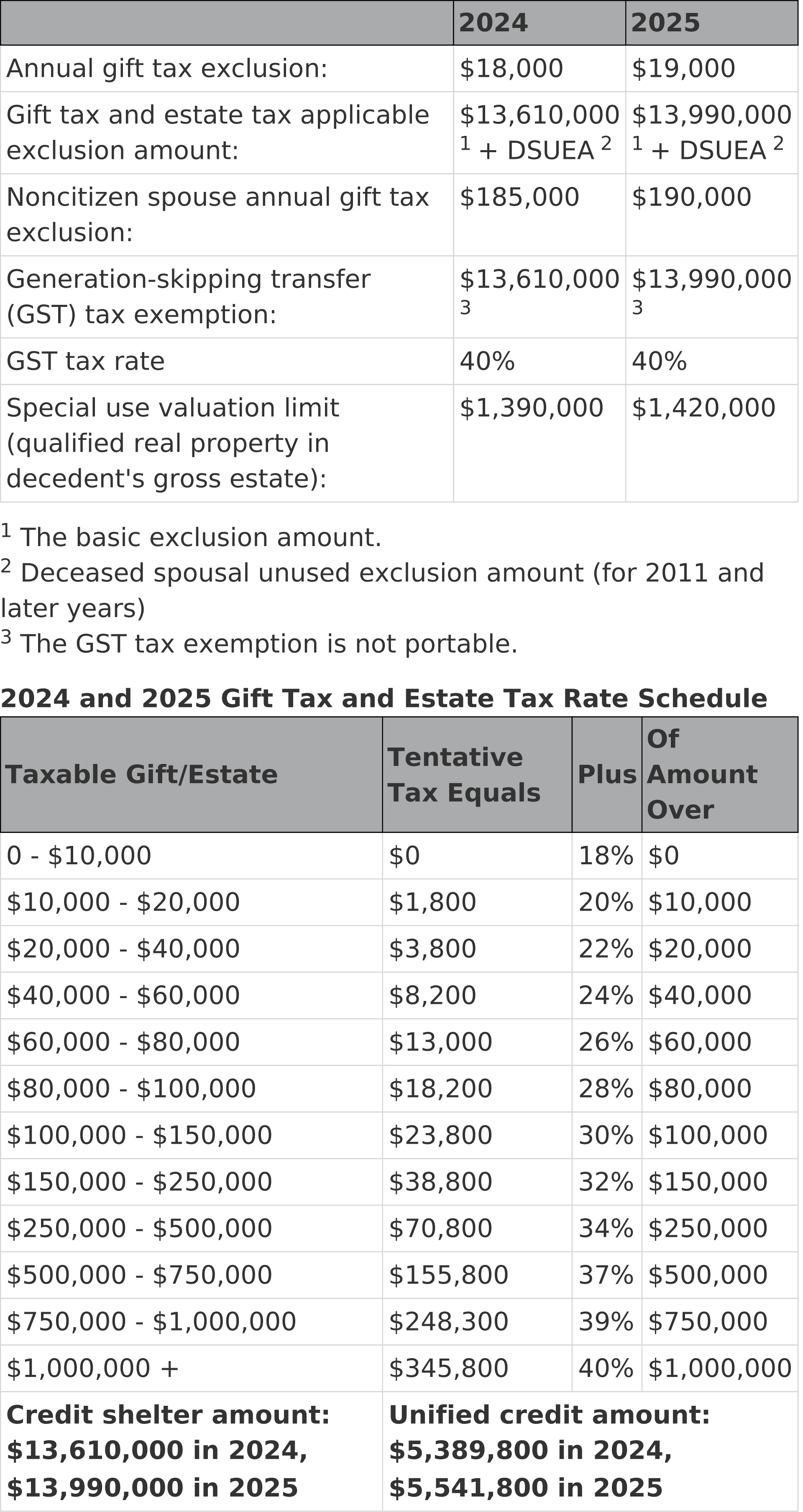 Here are some key numbers associated with estate planning, as well as the federal gift tax and estate tax rate schedules for 2024 and 2025.