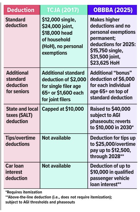 New Deductions This chart compares some major deductions from the 2017 Tax Cuts and Jobs Act (TCJA) with updates in the One Big Beautiful Bill Act (OBBBA), signed into law on July 4, 2025, and effective for the 2025 tax year.