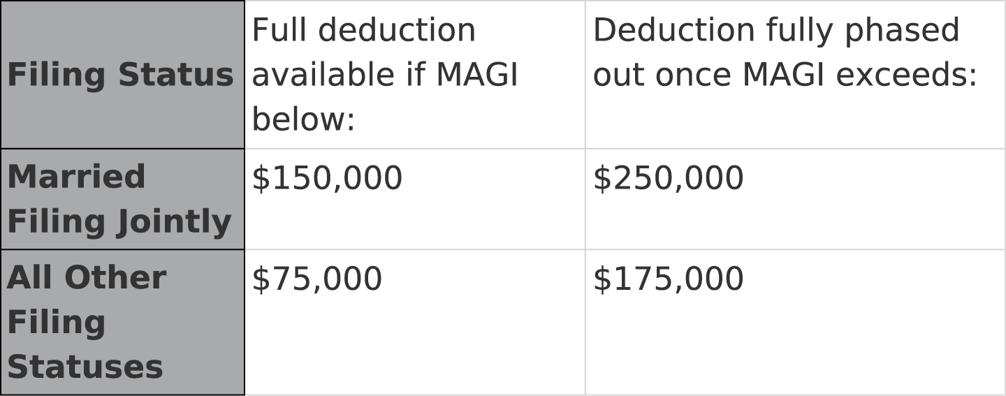 Married taxpayers age 65 or older with a combined MAGI of less than $150,000 and filing a joint tax return can both claim the deduction for a total of $12,000. The deduction for joint filers begins to phase out at $150,000 and is completely eliminated when their MAGI is $250,000 or more.