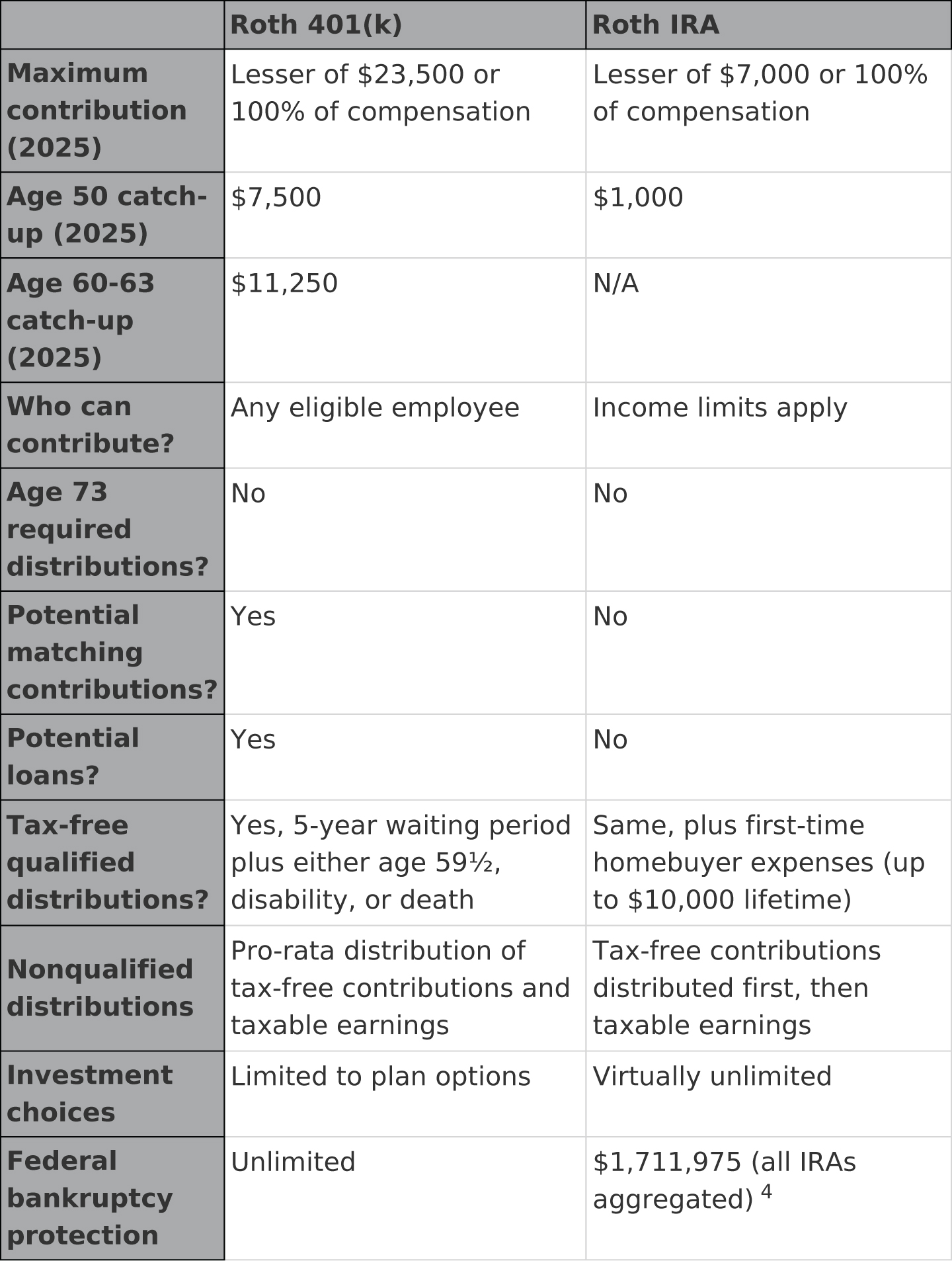 2You can avoid tax on the non-Roth portion of your distribution (any pre-tax contributions, employer contributions, and investment earnings on these contributions) by rolling that portion over to a traditional IRA. When considering whether to make a rollover or to keep your funds in your 401(k) plan, you should consider carefully the investment options, fees and expenses, services, ability to make penalty-free withdrawals, degree of creditor protection, and distribution requirements associated with each option. Roth IRAs are subject to separate five-year holding periods.